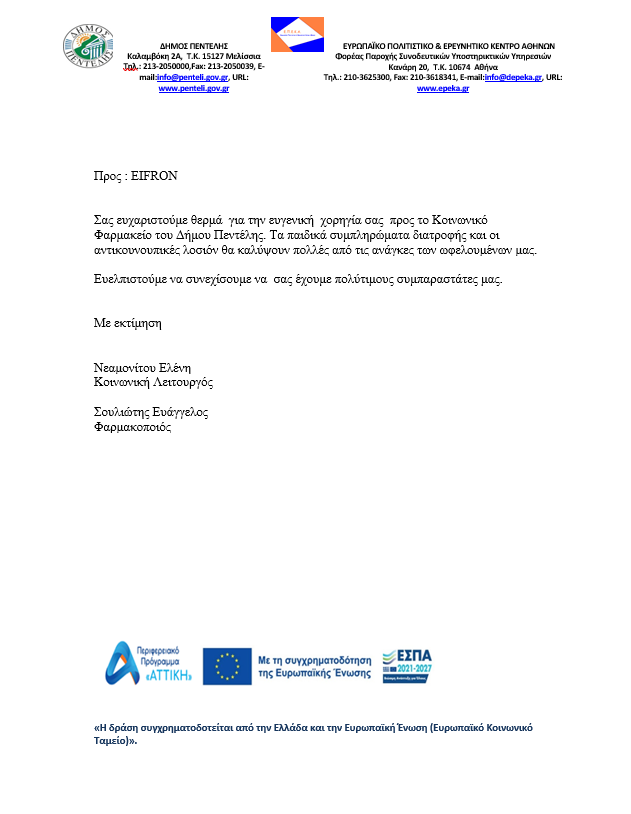 Στηρίζουμε έμπρακτα την κοινωνία – Ευχαριστήρια Επιστολή - Κοινωνικά Φαρμακεία των Δήμων Πεντέλης - Αίγινας