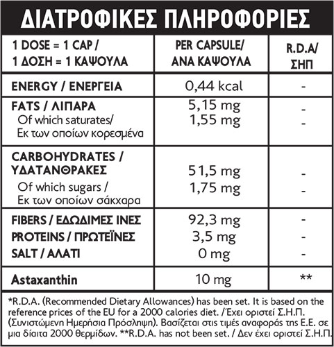 • Το προϊόν είναι ένα λειτουργικό τρόφιμο και δεν περιέχει κανένα από τα γνωστά αλλεργιογόνα. Συνιστάται να χρησιμοποιείται ως μέρος μιας υγιεινής διατροφής που περιλαμβάνει τακτική κατανάλωση φρούτων και λαχανικών.