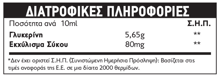 Άλλα Συστατικά: Nερό, Εκχύλισμα Μύρτιλου, Βενζοϊκό Νάτριο, Σορβικό Κάλιο, ∆εξτρόζη, Κιτρικό Οξύ, Κιτρικό Νάτριο, Ξανθάνη, Λεκιθίνη Ηλίανθου.
